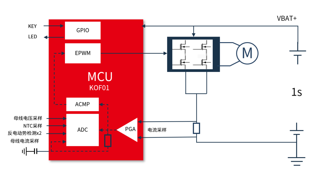 该方案的核心优势在于其高度集成的单芯片直驱架构。中微半导自主研发KOF01芯片作为方案“大脑”,集成了ARM Cortex -M0+内核、高精度ADC、可编程增益放大器及模拟比较器等专用外设,极大简化了外围电路。这不仅大幅降低了系统成本和PCB面积,为产品打造更为小巧、精致的形态提供了核心技术支撑,也提升了整机的可靠性。