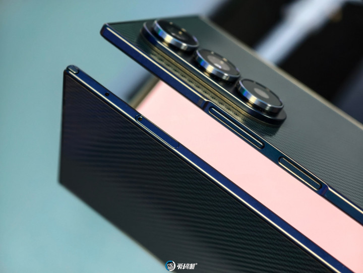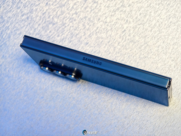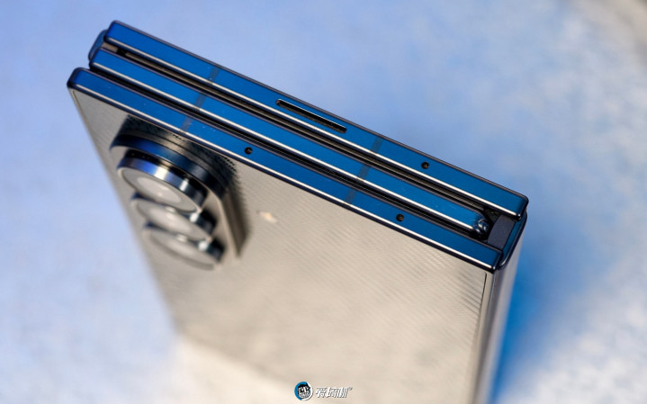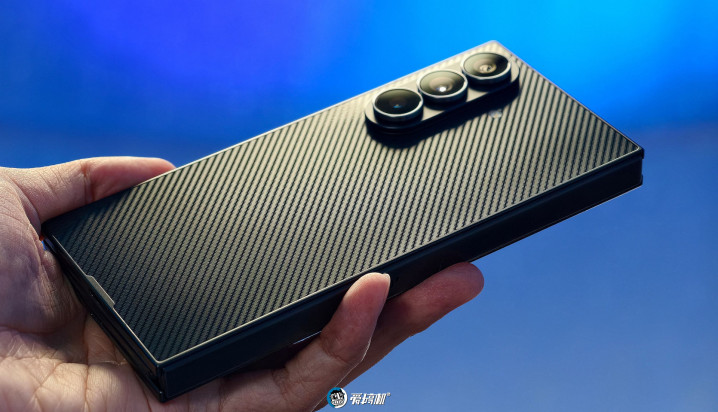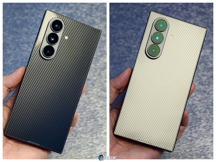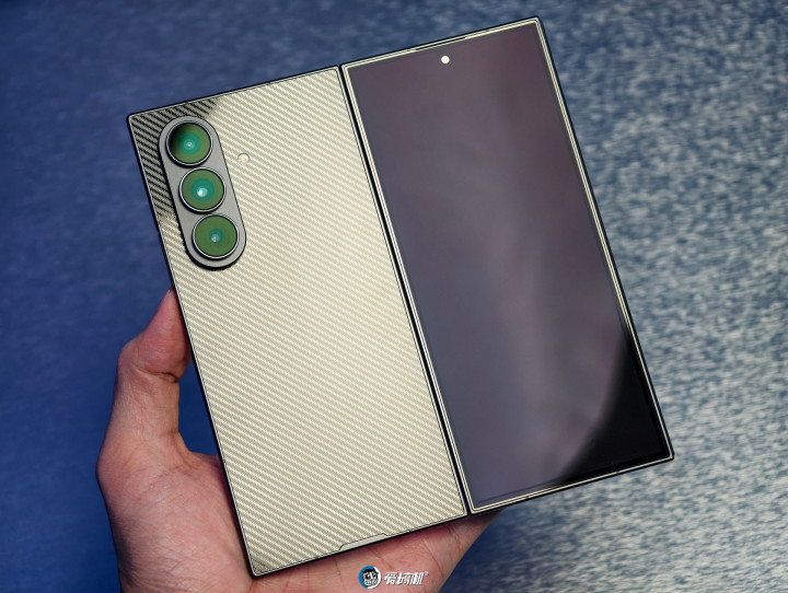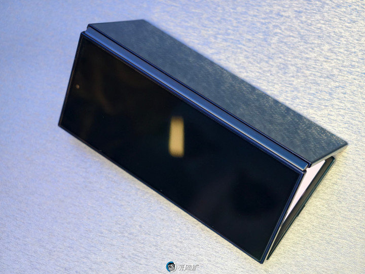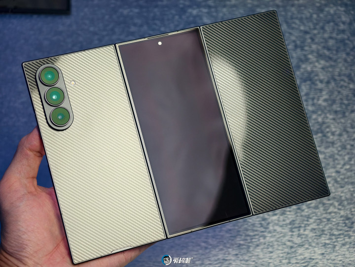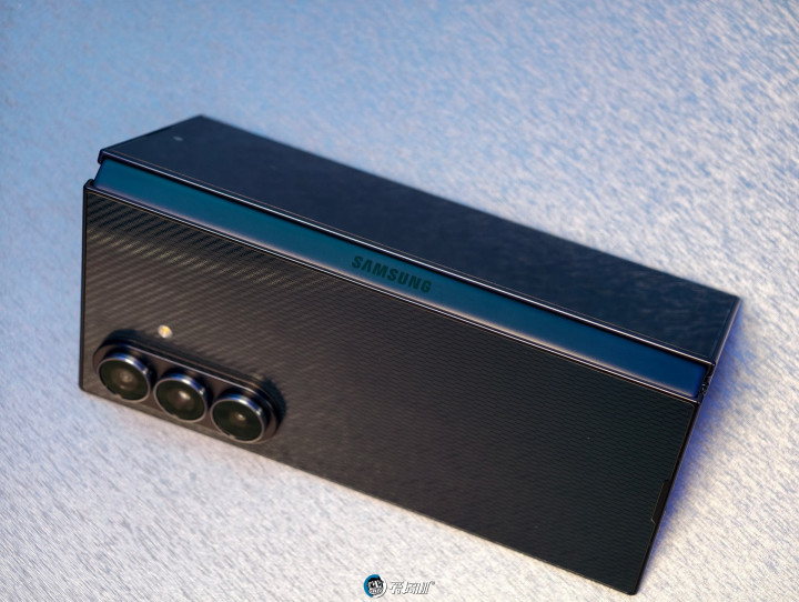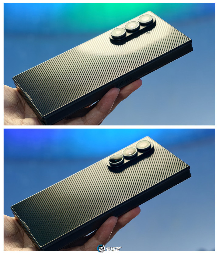 三星Galaxy Z TriFold这个“陶瓷玻纤后盖”,表面是平整的,下面有碳纤维的纹路,迎着光线会有明显的反光,五彩斑斓的黑了属于是。