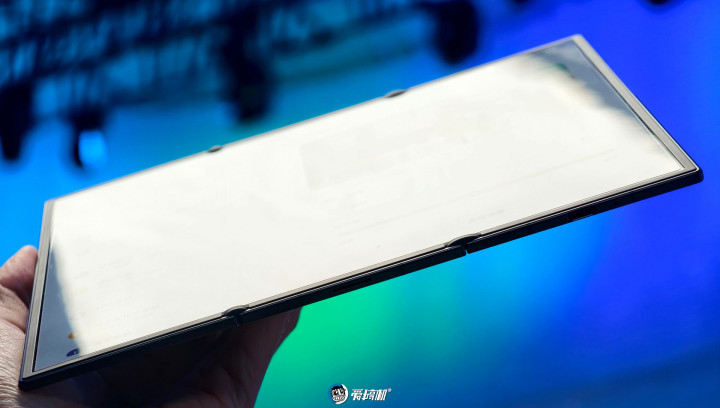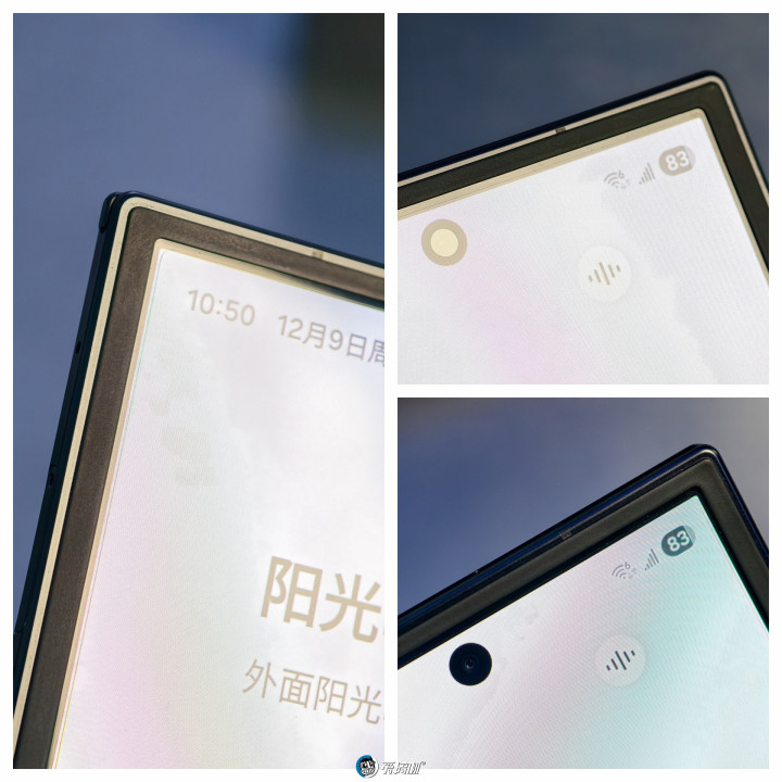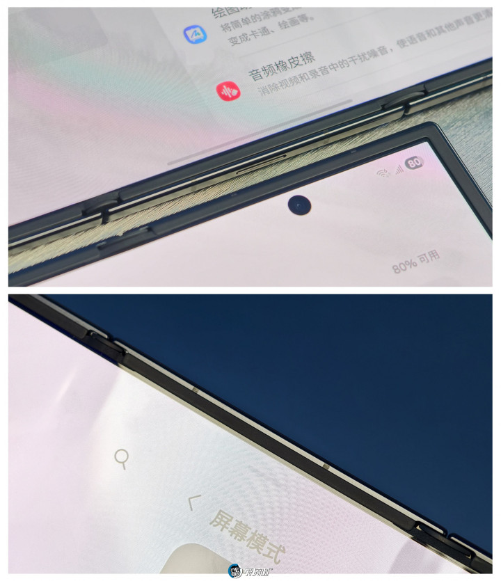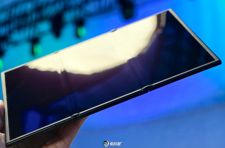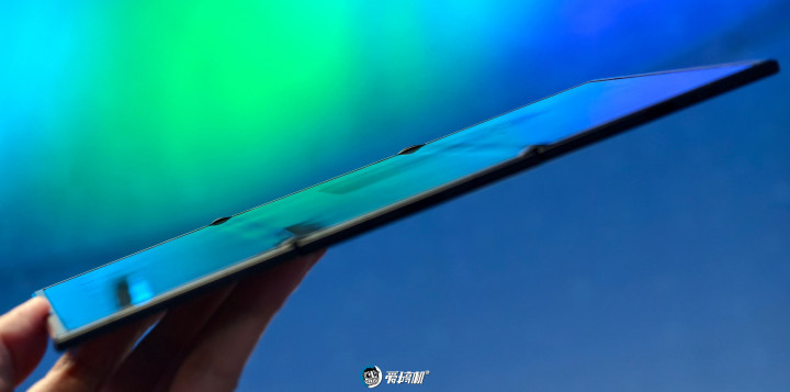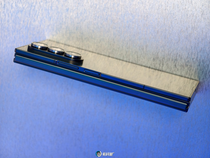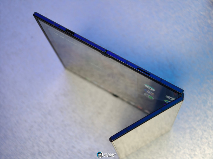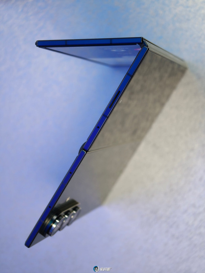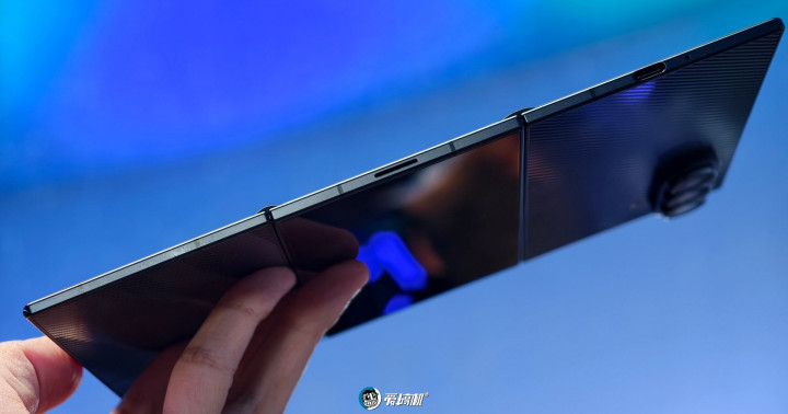 因为转轴半径不同,三星Galaxy Z TriFold右侧转轴区域会更加平整↑(屏幕被UTG玻璃和钛金属格架“包夹”)。